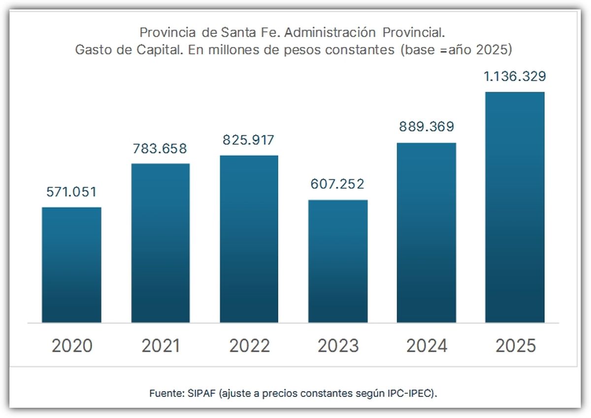 En paralelo, el Gobierno santafesino ejecutó un récord en gastos de capital, con inversiones que superaron los $1,13 billones, destinadas principalmente a seguridad, salud, educación e infraestructura.