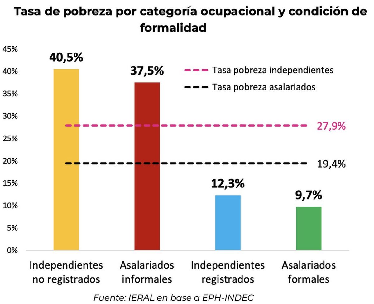 El estudio destaca que la informalidad laboral es un factor crucial en la pobreza laboral. Entre los trabajadores informales, la pobreza afecta al 40,5% de los independientes no registrados y al 37,5% de los asalariados informales. En comparación, los trabajadores formales presentan tasas mucho más bajas de pobreza: el 12,3% de los independientes registrados y el 9,7% de los asalariados formales.