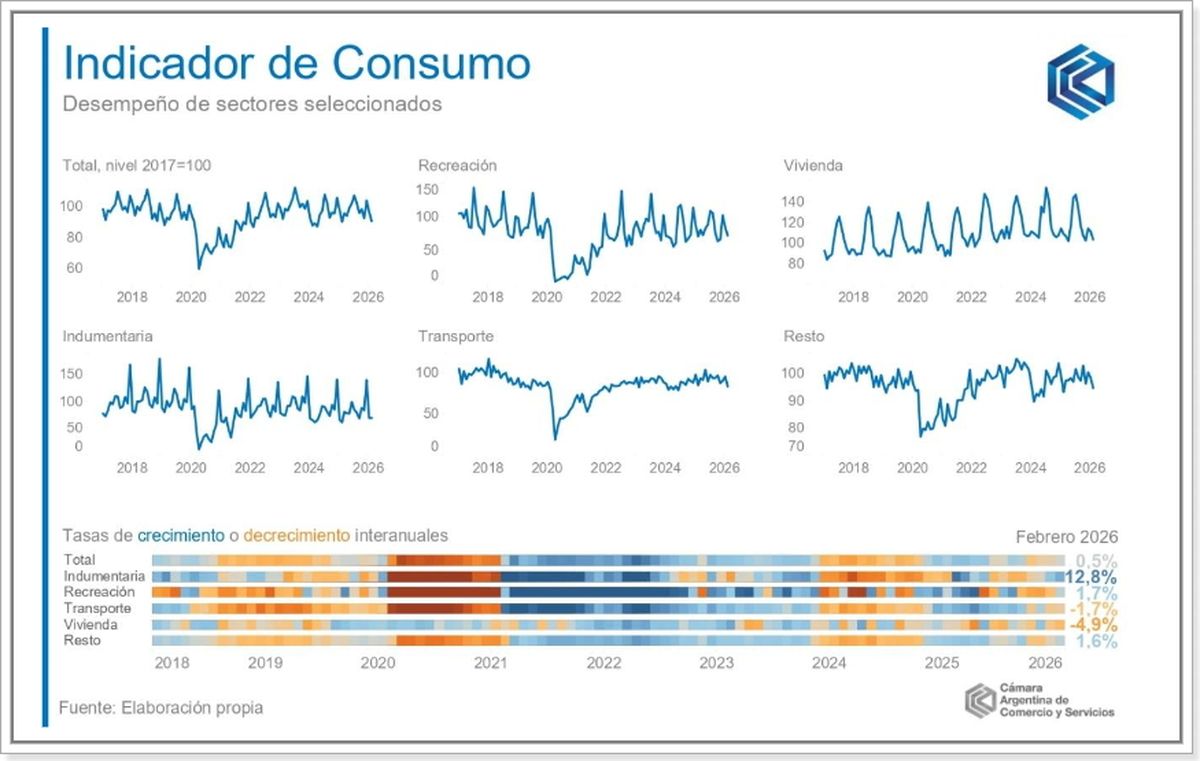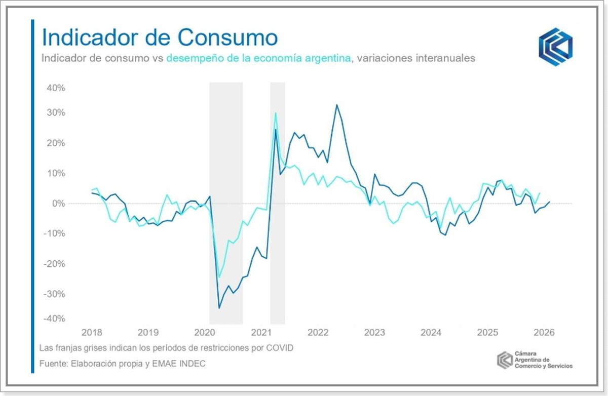 El consumo en la Argentina comenzó 2026 con una señal tenue de recuperación, pero lejos de ser homogénea. Según el último informe de la Cámara Argentina de Comercio y Servicios (CAC), en febrero el Indicador de Consumo (IC) creció un 0,5% interanual, cortando una racha de tres meses consecutivos en baja.