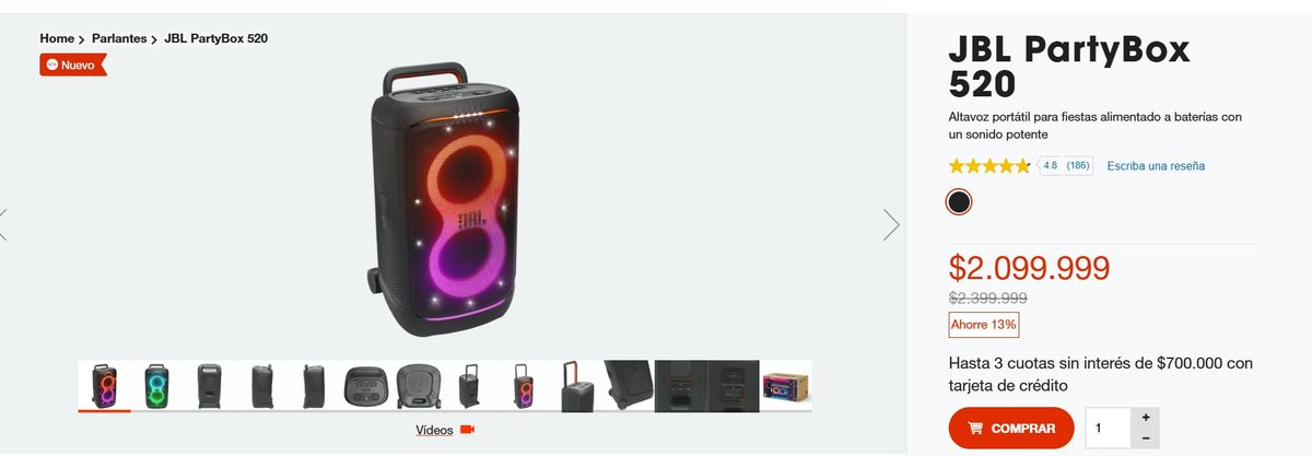 En enero de 2026, el JBL PartyBox 520 se consolida como uno de los altavoces portátiles para fiestas más potentes y completos disponibles en Argentina. Según el precio de referencia de la marca, su valor es de $2.099.999, ubicándose en el segmento premium dentro del catálogo de parlantes JBL pensados para eventos, reuniones numerosas y celebraciones de gran escala.