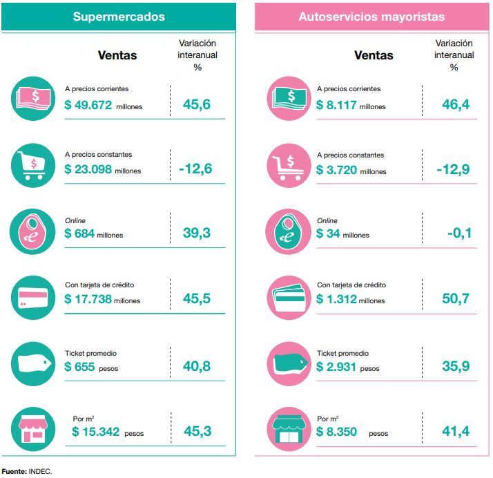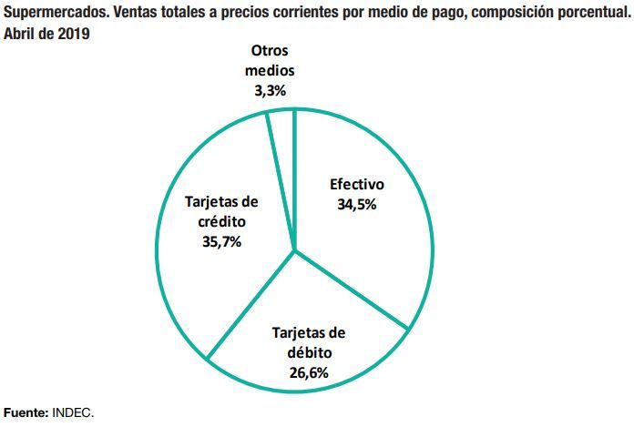 Según el informe, del total de ventas en supermercados durante abril, el 35,7% por tarjetas de crédito, un 34,5% fueron realizadas en efectivo, el 26,6% con tarjetas de débito y otros medios el 3,3%.