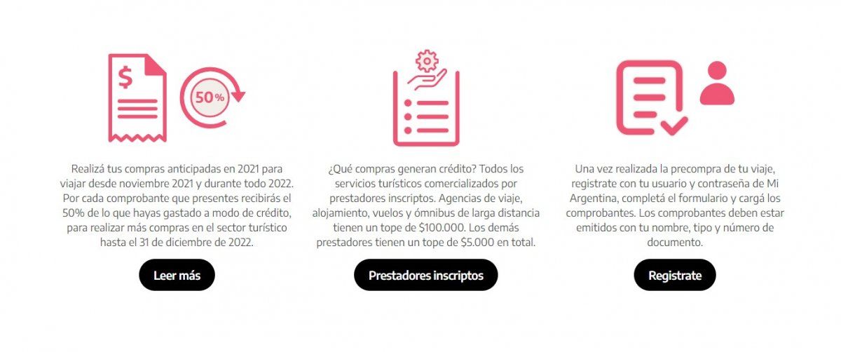Según el sitio oficial Previaje es un programa de preventa turística que te reintegra el 50% del valor de tu viaje en crédito, para viajar y disfrutar de todos los destinos de Argentina, desde noviembre de 2021 y durante todo el 2022. Podés Realizar tus compras anticipadas en 2021 para viajar desde noviembre 2021 y durante todo 2022. Por cada comprobante que presentes recibirás el 50% de lo que hayas gastado a modo de crédito, para realizar más compras en el sector turístico hasta el 31 de diciembre de 2022.
