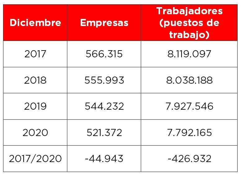 Ya el panorama empresario laboral había sido crítico en 2016 y 2017 porque en esos años hubo una reducción de casi 3.000 empleadores, pero en los tres años siguientes fue un derrumbe.