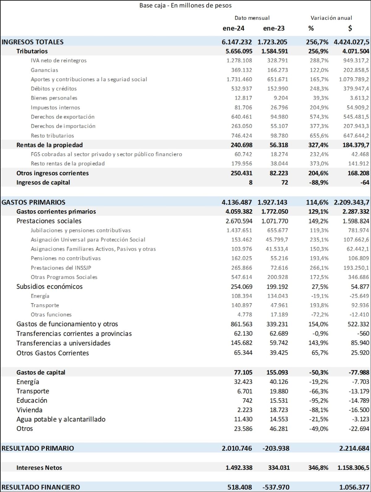 El Sector Público Nacional (SPN) registró en enero un superávit financiero de $518.408 millones, producto de un superávit primario de 2 billones 10.746 millones de pesos y del pago de intereses de la deuda pública neto de pagos intra-sector público, que alcanzó 1 billón 492.338 millones de pesos.