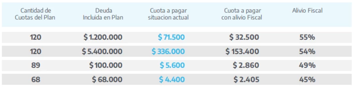 Esto significa que, por ejemplo, un contribuyente que debía pagar una cuota de $71.500 por un plan de 120 cuotas, ahora deberá abonar $32.500; es decir que queda alcanzado por un 55% de alivio fiscal.