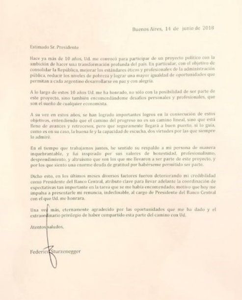 En la misiva que le envió al presidente Mauricio Macri, el economista le agradeció las oportunidades que le dio en los últimos diez años. “Usted me ha honrado, no sólo con la posibilidad de ser parte de este proyecto, sino también encomendándome desafíos personales y profesionales, que son el sueño de cualquier economista“, subrayó.