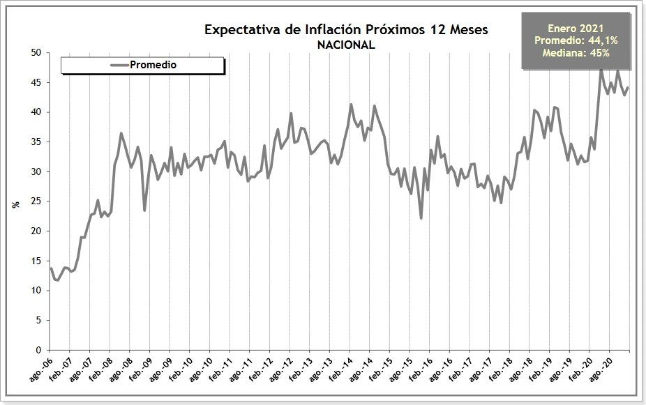 La inflación esperada por la población para los próximos doce meses es de 45%, según la mediana de las respuestas, y 44,1% según el promedio, dice el informe.
