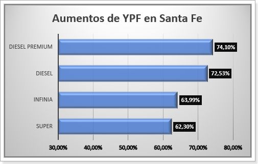Según registros de Aire de Santa Fe Digital, en estaciones de servicios de la ciudad, la Nafta Super de YPF (la petrolera líder del mercado, con el 55% de participación) subió un 62,30%, en lo que va del año. La línea Premium Infinia escaló un 64%.