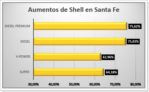 A su vez, en las estaciones de Shell, la Super subió un 64,18% y la V-Power acumuló un incremento del 62,96%.