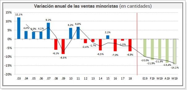 El consumo no repunta. Las ventas minoristas de los comercios pymes cayeron un 14,1% en mayo frente a igual mes de 2018 y acumularon 17 meses de bajas consecutivas según un relevamiento de la Confederación de la Mediana Empresa (Came).