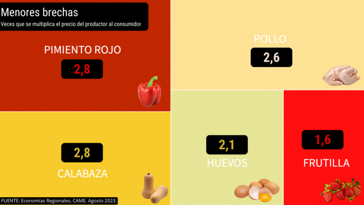 Por el lado de los productos que presentaron menor diferencia entre el precio que recibió el productor y el que pagó el consumidor se encuentran dos de origen animal: los huevos y el pollo; y tres frutihortícolas: el pimiento, la calabaza y la frutilla.