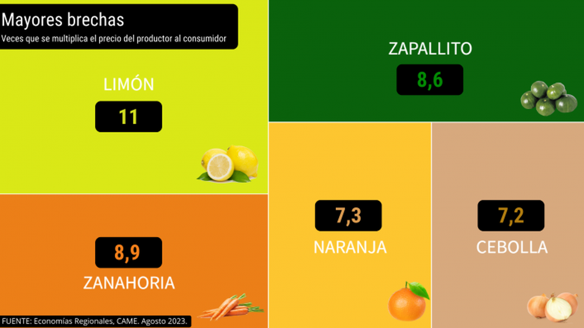 Los productos que mayor brecha de precios presentaron entre el origen y el destino durante el mes pasado fueron el limón (11 veces), la zanahoria (8,9), el zapallito (8,6), la naranja (7,3) y la cebolla (7,2).