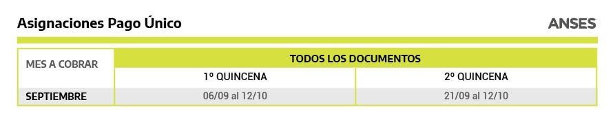 Las asignaciones de pago único de la primera quincena de este mes se pagan entre el 6 de septiembre y el 12 de de octubre. En tanto, las de la segunda quincena se pagan entre el 21 de septiembre y el 12 de octubre.
