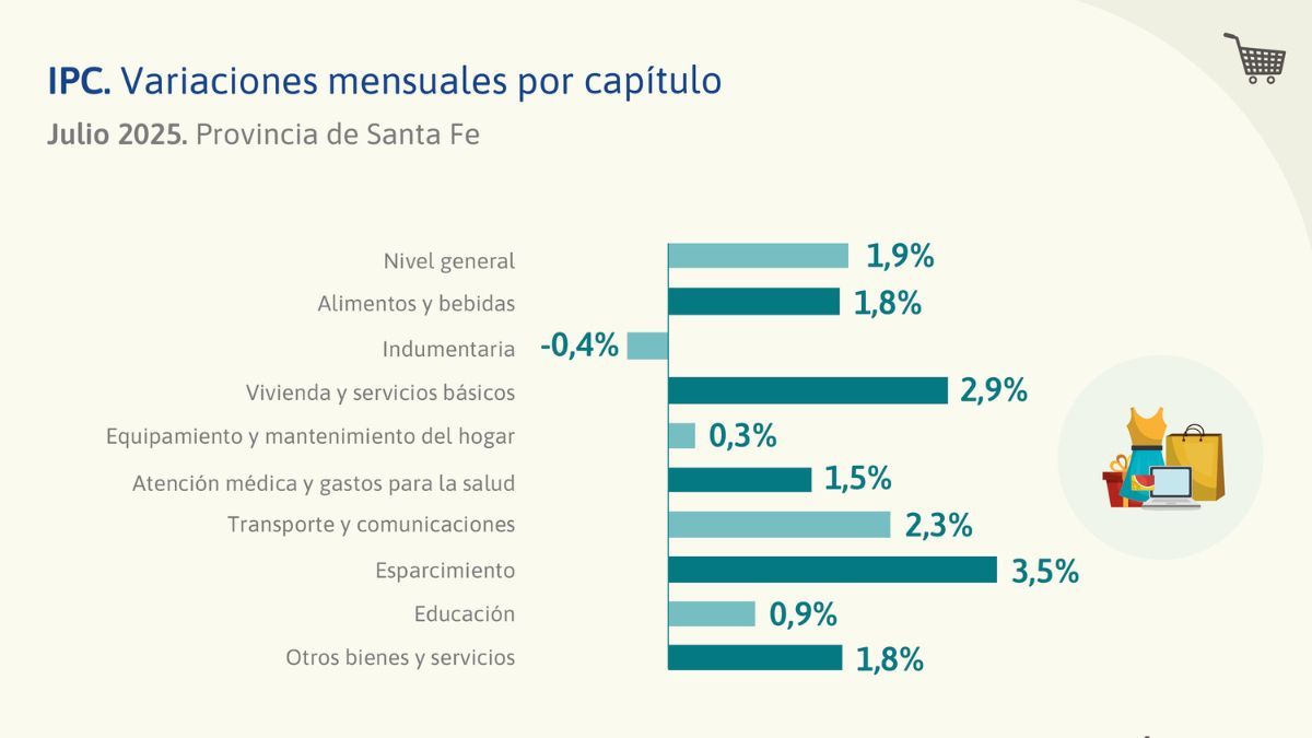 El Instituto Provincial de Estadísticas y Censos (IPEC) dio a conocer este lunes el dato de inflación de la provincia de Santa Fe, que con un 1,9% en julio, vuelve a estar por debajo de la barrera del 2% mensual por tercer mes consecutivo y en los mismos niveles que la media nacional.