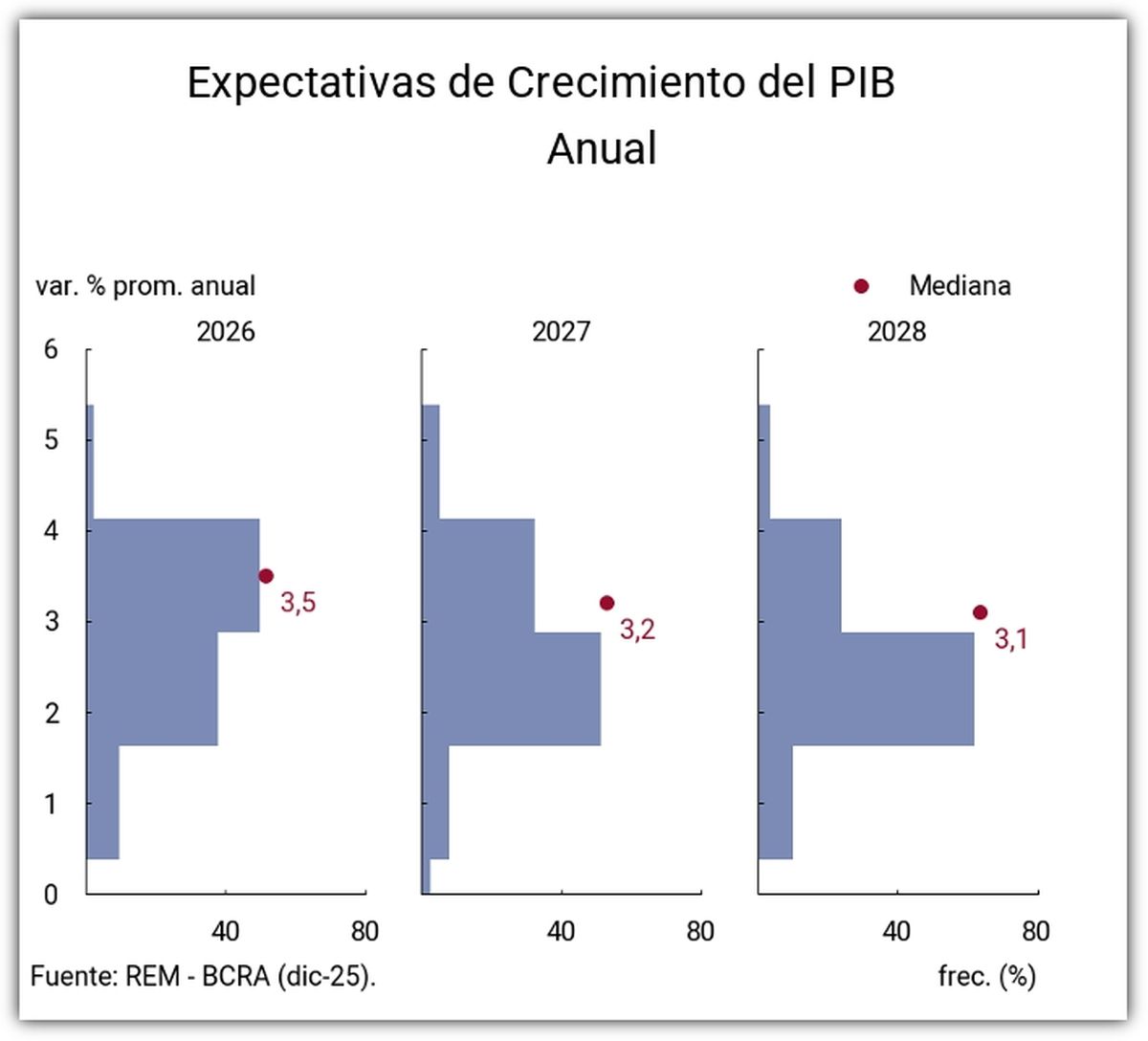 Según el último Relevamiento de Expectativas de Mercado (REM) que elabora el Banco Central (BCRA), los analistas esperan que la economía consolide en 2026 la salida de la recesión, luego del rebote registrado en 2025, con una inflación significativamente más baja, un tipo de cambio sin saltos bruscos y continuidad del superávit fiscal.