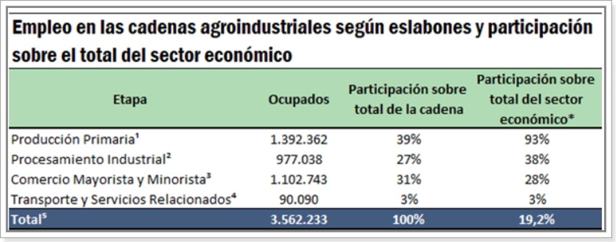 Del sector manufacturero, el 38% del empleo del está relacionado a los complejos agroindustriales, mientras que el 28% del empleo en el comercio mayorista y minorista es atribuible a las cadenas agroindustriales.