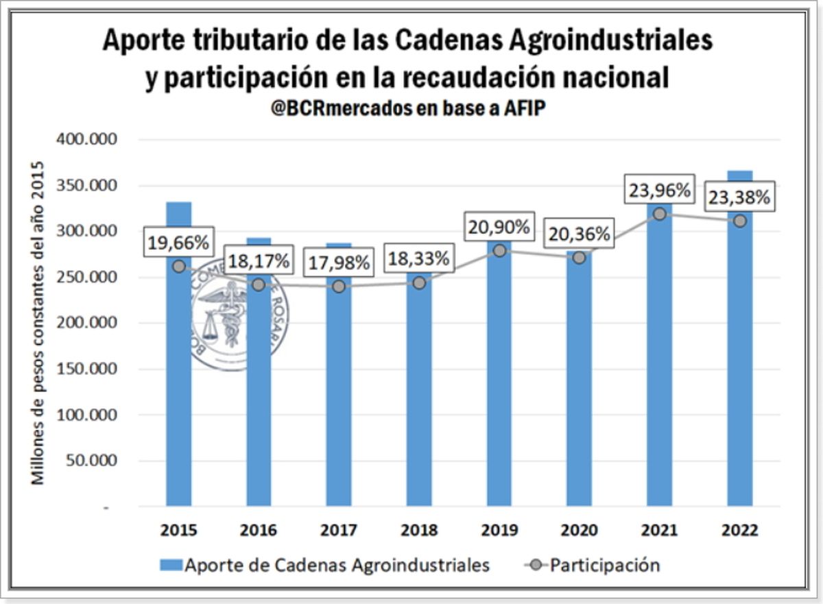Considerando que la recaudación anual reportada por la AFIP totalizó $ 21.540.626 millones durante el año pasado, el campo y las cadenas agroindustriales habrían representado un 23,4% del total, es decir, casi 1 de cada 4 pesos ingresados a las arcas del Estado Nacional.