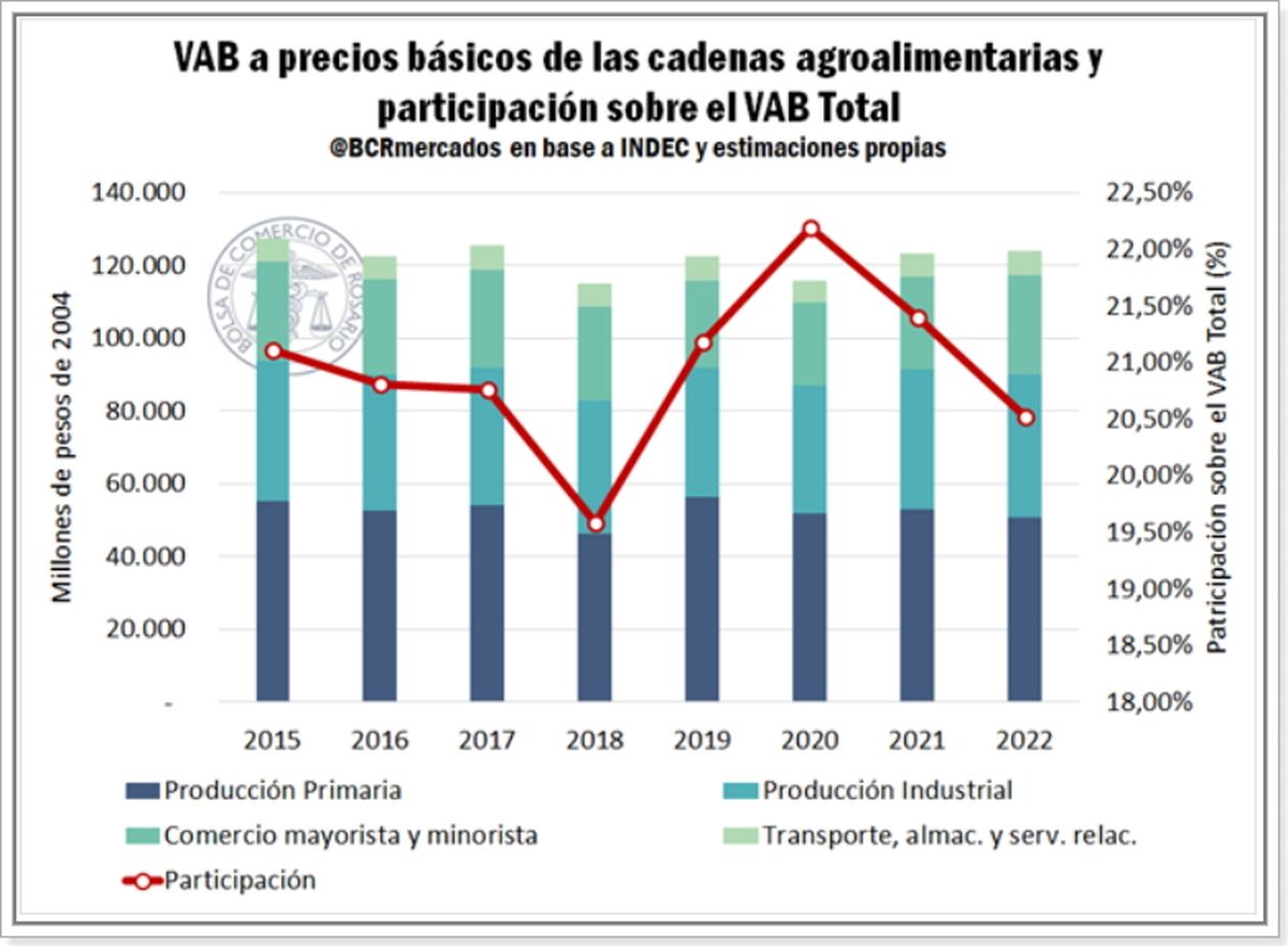 Las cadenas agroalimentarias explicaron 1 de cada 5 pesos del PBI argentino en 2022. El Valor Agregado Bruto (VAB) agroalimentario alcanzó en 2022 un estimado de 123.988 millones de pesos de 2004, creciendo un 0,6% respecto del valor alcanzado en 2021. Esto equivale al 20,5% del PIB argentino de 2022.