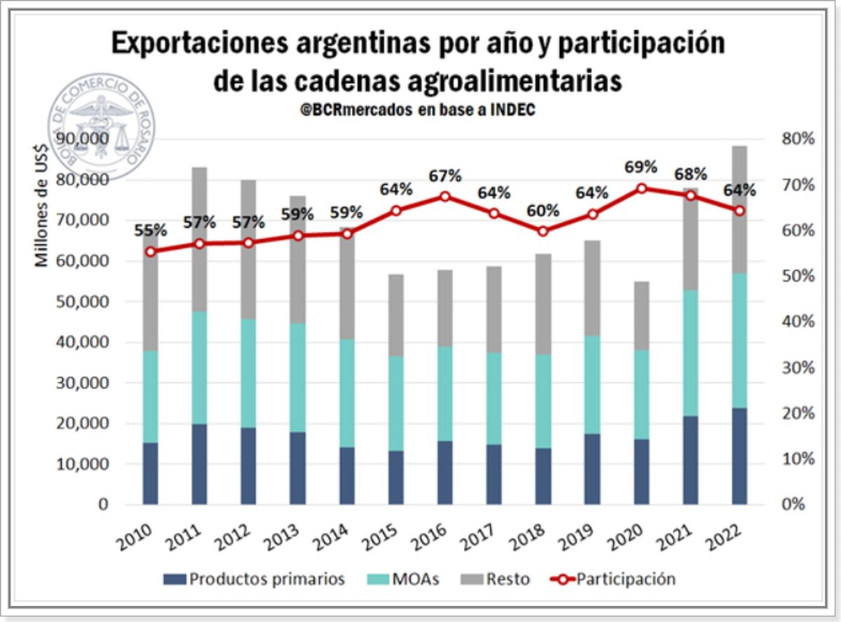 No obstante, a pesar del récord nominal alcanzado por el sector, dado que el país alcanzó durante el año previo el mayor valor exportado de su historia, la participación de las cadenas cayó levemente respecto del año previo (68% en 2021 vs. el mencionado 64% del 2022).