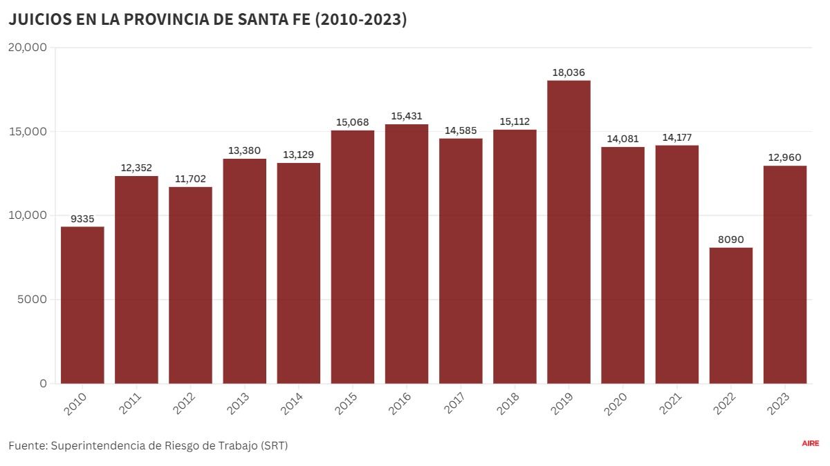 Según la SRT, de 2010 a 2023, en Santa Fe hubo 187.483 juicios. Solo superan a la provincia, Buenos Aires con 373.380 y CABA con 279.226. Por debajo están Córdoba con 116.418 y Mendoza con 92.954 casos. En estas y las anteriores cifras, se consideran los juicios iniciados por personas trabajadoras en unidades productivas (empresas) y en casas particulares.