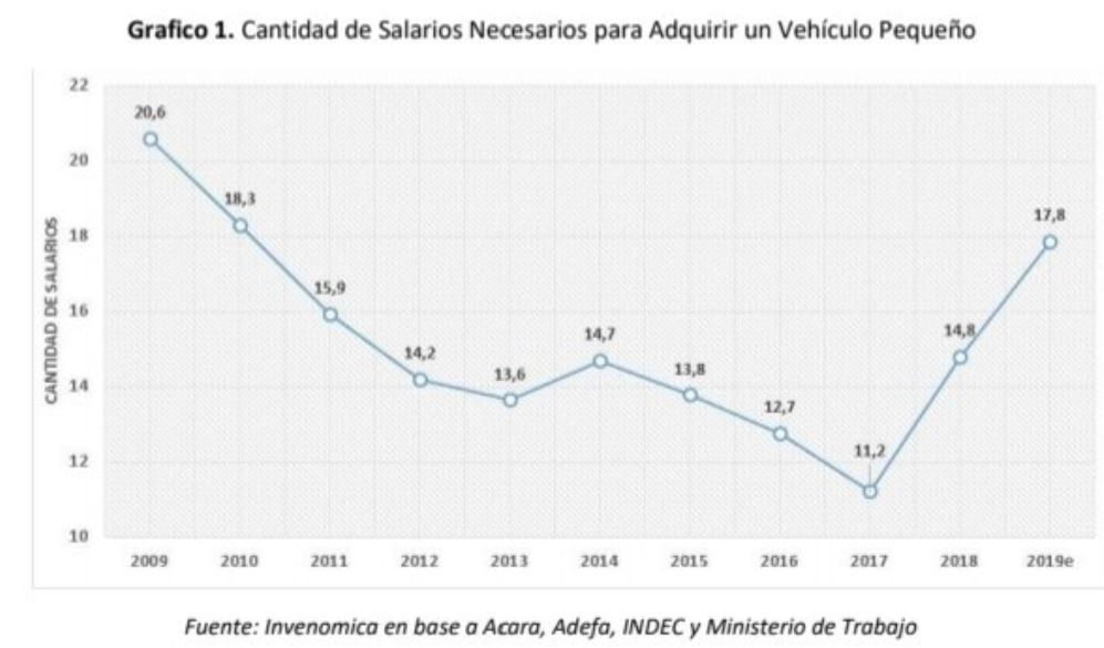 La Asociación de Concesionarios de Automotores (Acara) informó que se necesitaron 17,8 sueldos para comprar un auto pequeño en Argentina en 2019. Esto representa tres salarios más que un año antes, cuando se requerían 14,8.