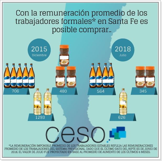En tanto, un santafesino que cobra una Asignación Universal por Hijo (AUH) puede adquirir 5 envases de leche en polvo (8 en 2015), 64 paquetes de azúcar (41 paquetes menos que en 2015), 33 litros de leche entera (contra 40 hace 3 años).