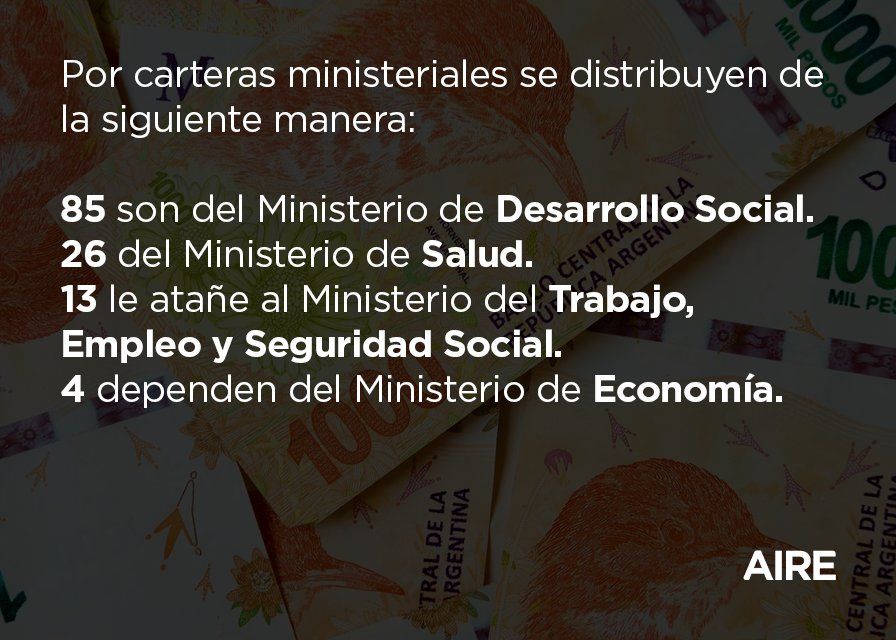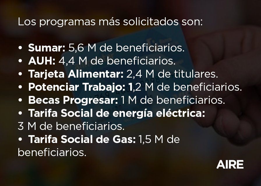 "Decimos que hay muchos planes sociales, pero la cobertura a la que acceden es mínima", detalló Ingaramo. Actualmente, en el país existen 141. Entre los más conocidos están el Sumar (5,6 millones de beneficiarios), la AUH (4,4 millones), la Tarjeta Alimentar (2,4 millones), Potenciar Trabajo (1,2 millones), Becas Progresar (1 millón), Tarifa Social de energía eléctrica (3 millones) y Tarifa Social de Gas (1,5 millones).