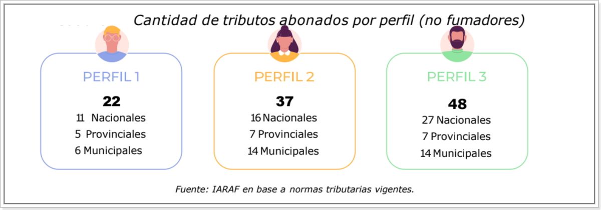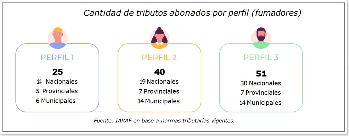En efecto, una persona fumadora del perfil 1 puede pagar al menos 25 diferentes tributos en el año, una del perfil 2 al menos 40 tributos y una del perfil 3 al menos 51 diferentes tributos.