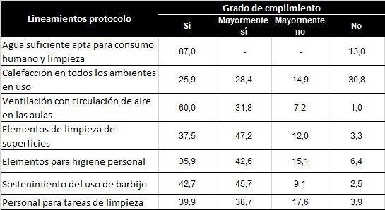Sobre el resto de los protocolos, se advierte que hay agua suficiente en el 87% de las escuelas, que cuentan con calefacción en todos los espacios solo el 54,3%, que tienen ventilación cruzada solo el 71,8%, que cuentan con elementos de limpieza el 84,7% y de higiene personal el 78,5%, que en el 88,4% de las instituciones se cumple con el uso del barbijo y que el 78,6% tiene personal encargado de tareas de limpieza.