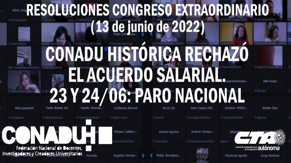 "Recordamos que la propuesta del gobierno consistió en mantener el 41 % ya acordado en marzo, adelantando cuotas: 16 % a junio (a cobrar en julio) y 12 % a julio (a cobrar en agosto), con revisión en agosto 2022", indicó el gremio, y agregó: "El Congreso de CONADU Histórica consideró que esta oferta no representa una recuperación del poder adquisitivo de los salarios que seguirán quedando, al menos, 10 puntos por debajo de la inflación acumulada".