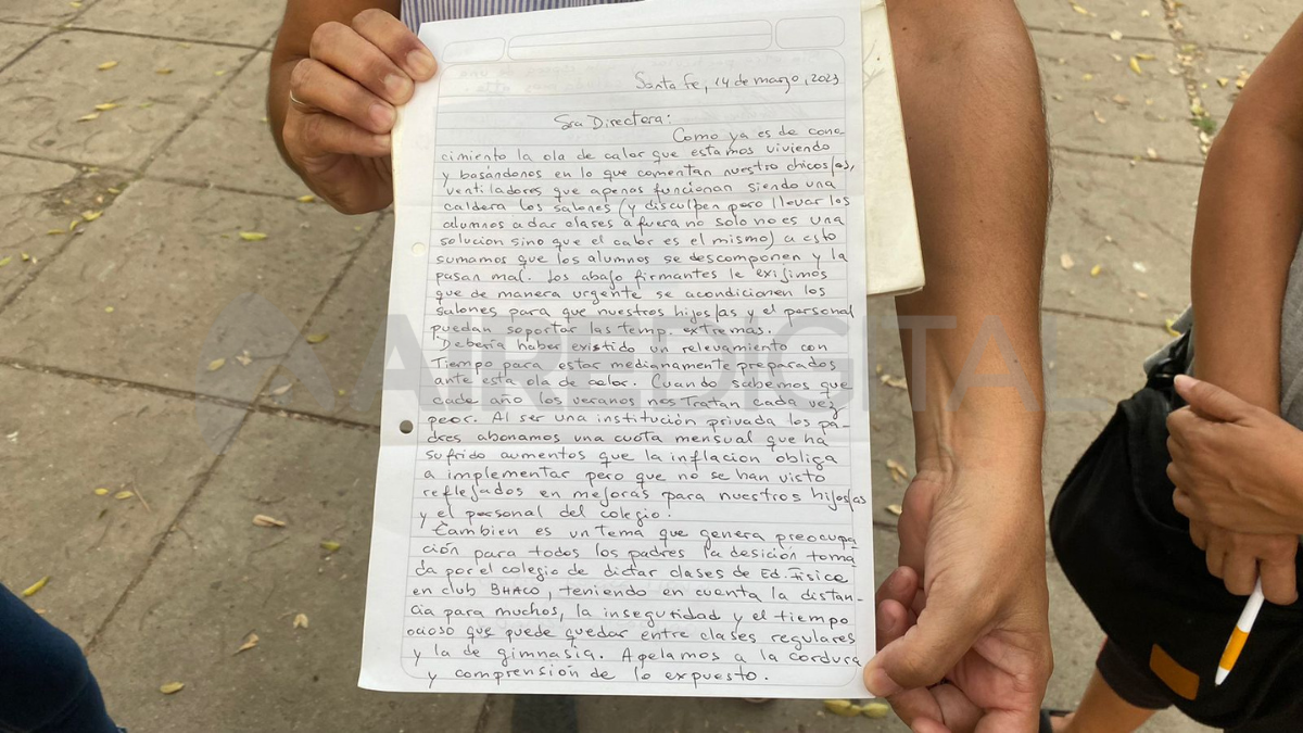 Tal es la situación en la entidad que los padres realizaron una nota en la que se expresa el malestar y el reclamo para que la comunidad educativa cuente con las condiciones habituales para atravesar la jornada. "La nota surgió a raíz de que ayer vimos una mamá ingresando con un ventilador", relató una de las madres que encabezó el reclamo.