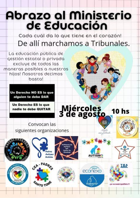 El próximo miércoles 3 de agosto las organizaciones que trabajan para informar, contener a las familias y capacitar a las personas para tratar niños, niñas y adolescentes con Trastorno del Espectro Autista (TGA) y Trastorno General del Desarrollo (TGD), realizarán un abrazo simbólico frente al Ministerio de Educación, exigiendo que se cumpla con el derecho de acceso igualitario a la educación previsto por la Ley Nacional 26.206 y que en la provincia cuenta con el Proyecto de Integración Interinstitucional de Niños, Adolescentes y Jóvenes con Discapacidad, normado bajo Decreto 2703 del año 2010.