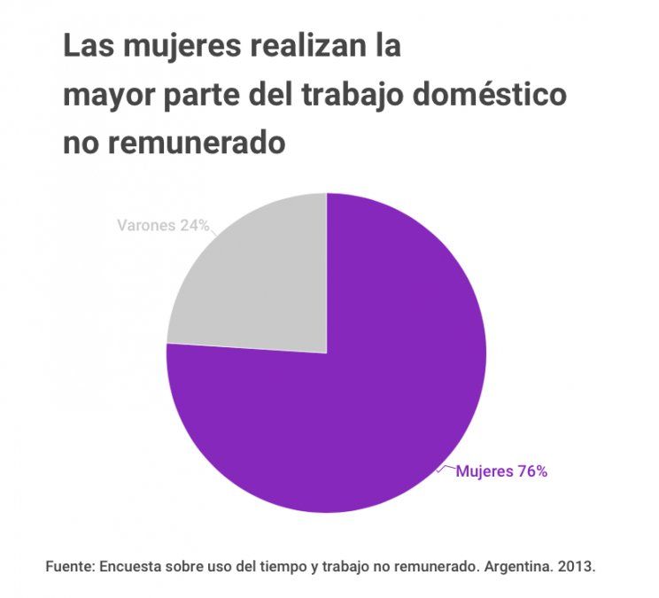 De acuerdo a la Organización Internacional del Trabajo (OIT), en 59 países del mundo las mujeres usan el 19 por ciento de su tiempo, todos los días, en las llamadas tareas domésticas no remuneradas. ¿Los varones? Solo el 8 por ciento de su tiempo. En Argentina, la Encuesta sobre Trabajo No Remunerado y Uso del Tiempo del Indec en 2013 mostró que la participación total de los hombres en el trabajo doméstico no remunerado es del 24 % y la de las mujeres ascendía al 76 %.
