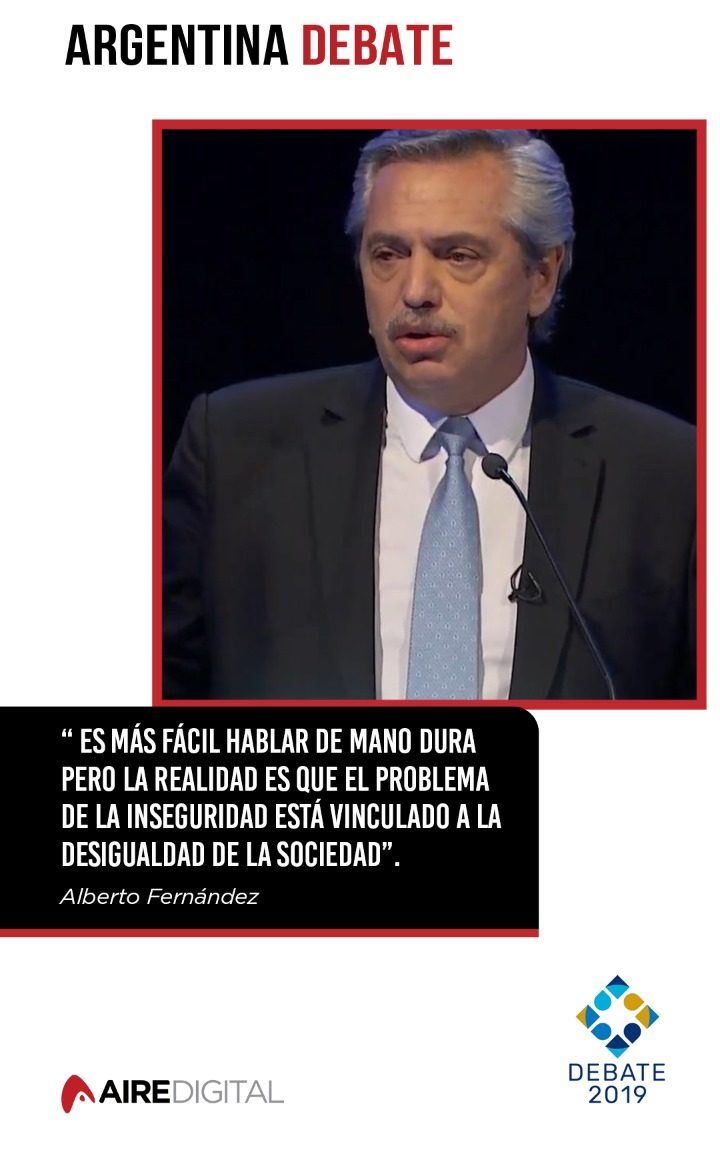 El nudo del compañero de fórmula de Cristina Fernández fue el problema de la desigualdad, más que de las estrategias criminales para combatir el delito. “Hace 35 años que soy docente en esta facultad. Es más fácil hablar de mano dura y penas más fuertes. Todo este problema está ligado a la desigualdad. Esto cuesta entenderlo y es así. Se ha cortado el entramado social por la crisis. Los controles sociales de la familia y escuela se fueron rompiendo. Al que delinque hay que castigarlo”, aseguró Alberto Fernández y propuso crear “un consejo de seguridad, en el que se involucrarán todos y se haga política criminal en serio”. Otro eje que usó para contragolpear a Macri fue el del presupuesto, que -de acuerdo a Alberto Fernández- bajó el último año. Y cerró, con su muletilla: “Hablemos en serio”.