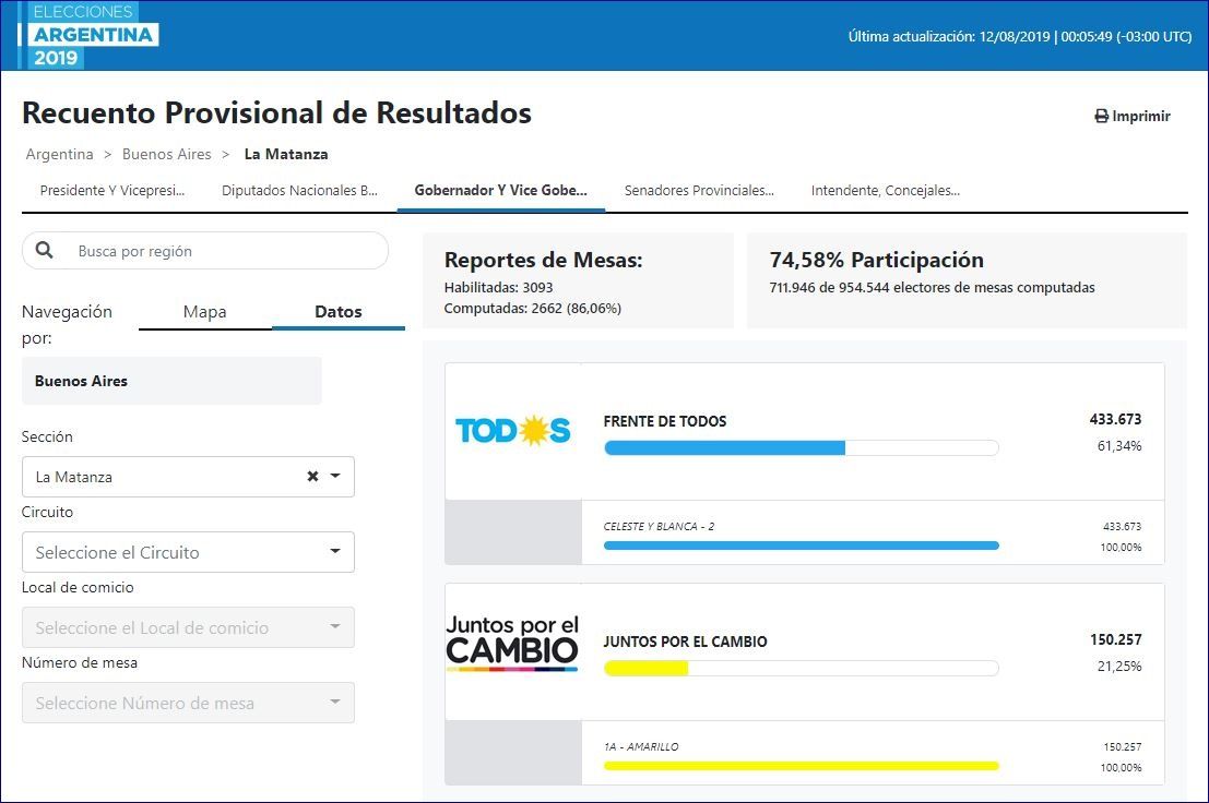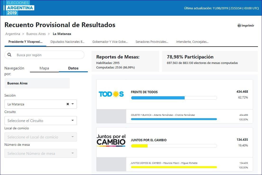 Con 1.117.152 electores habilitados para votar, La Matanza es un distrito que tiene más peso electoral que varias provincias del interior argentino. Además, es un bastión histórico del peronismo, lo que quedó ratificado una vez más en las Paso de este domingo: con el 87% de las mesas escrutadas, la fórmula presidencial del Frente de Todos -conformada por Alberto y Cristina Fernández- obtenía 62,7% de los votos y una distancia de 42% respecto a la oficialista alianza de Juntos por el Cambio: una diferencia abismal que ningún sondeo llegó a prever.