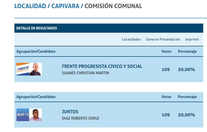 En la categoría comisión comunal, los dos candidatos a liderar la localidad de Capivara, en el departamento San Cristóbal, empataron en 109 votos según los datos del escrutinio provisorio que computó el 100% de las mesas. Se trata de Christian Suanes (Frente Progresista) y Roberto Díaz (Frente Juntos), quienes de mantenerse la igualdad definirán la jefatura comunal mediante un sorteo por bolillero en una audiencia que deberá convocar el Tribunal Electoral y de la participarán los fiscales y apoderados de partidos.