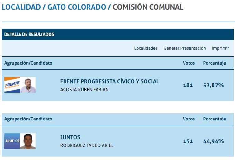 Rubén Acosta del Frente Progresista Cívico y Social obtuvo 181 sufragios, contra 151 que cosechó Tadeo Rodríguez, el candidato de Juntos. El escrutinio definitivo deberá contabilizar la mesa que falta y determinar si el resultado coincide con el de la noche del domingo, cuando sólo se había informado el 75% de los votos.