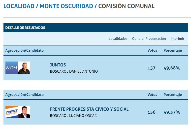 A tan solo 1 voto. Esa es la diferencia entre los dos candidatos a presidente comunal de Monte Oscuridad que insólitamente tienen el mismo apellido. Según el conteo provisorio en la localidad del departamento San Cristóbal hay 2 votos a determinar que podrían cambiar el resultado de esta elección.