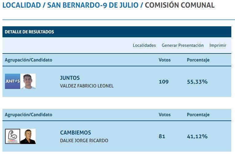 Según los datos del escrutinio provisorio, Fabricio Valdéz (Juntos) obtuvo 109 sufragios y Jorge Dalke (Cambiemos) 81; pero se contabilizó 1 mesa de 2.