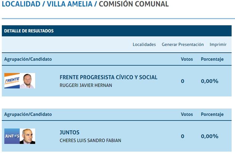 En Villa Amelia, la localidad que se encuentra en “el taco de la bota” santafesina (departamento Rosario), los votos fueron cero. Finalizados los comicios no se informaron datos de ninguna de las 5 mesas donde un total de 1.368 electores estaban habilitados para participar de los comicios. Deberán esperar el conteo definitivo para conocer a su nuevo presidente comunal. Los candidatos aún en pugna son: Javier Ruggeri (FPCyS) y Luis Cheres (Juntos).