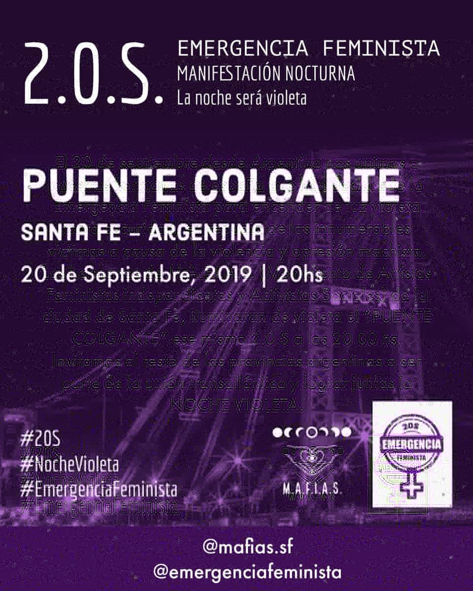 En la capital provincial la convocatoria fue lanzada por M.A.F.I.A.S. (Movimiento de Artistas Feministas Independientes y Activistas Sociales). Lo que se busca es declarar la Emergencia Feminista este 2.0.S, es por ello que los distintos puntos emblemáticos y atracciones locales alrededor del mundo se iluminarán de violeta. En Santa Fe se teñirá el puente colgante, lugar de encuentro a partir de las 20 horas este viernes. Habrá un escenario con más de 14 artistas mujeres y disidencias.