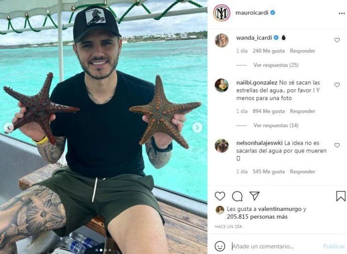 Icardi se mostró sosteniendo a dos estrellas de mar fuera del agua, actitud que fue fuertemente repudiada por los usuarios. Mientras, él se mostró sonriente por el momento: "Ella me dijo que las agarrara", escribió, haciendo alusión al pedido de su esposa.