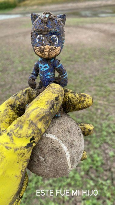 Luego, apuntó contra su hijo por algunos de los objetos encontrados. “Este fue mi hijo”, indicó, mostrando un muñeco y una pelota de tenis. “Tarea cumplida”, expresó orgullosa, mientras grababa la laguna seca.