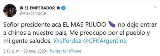 “Señor presidente acá EL MÁS PIJ.... No deje entrar a chinos a nuestro país. Me preocupo por el pueblo y mi gente saludos”, manifestó arrobando al mandatario y a Cristina Kirchner.