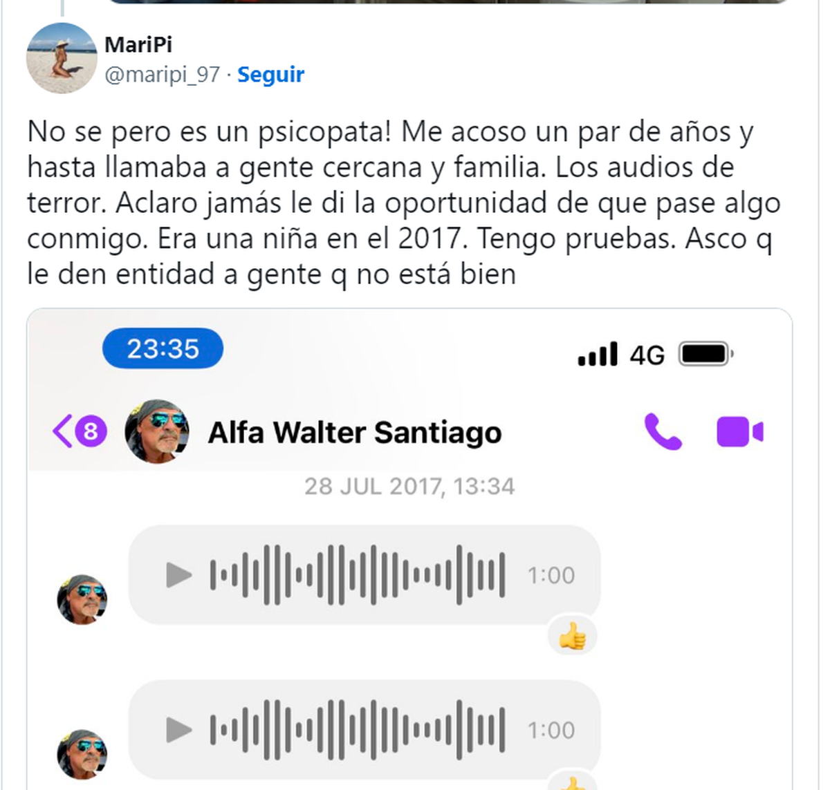 "Me acosó un par de años y hasta llamaba a gente cercana y familia. Los audios de terror. Aclaro jamás le di la oportunidad de que pase algo conmigo. Era una niña en el 2017. Tengo pruebas. Asco que le den entidad a gente que no está bien", sostuvo.