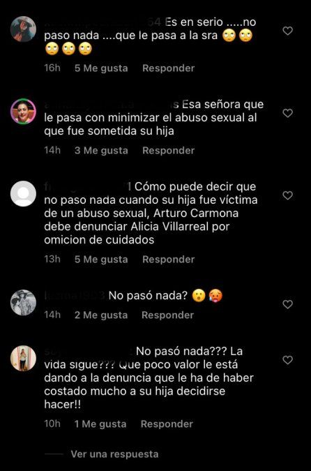 "Esa señora qué le pasa con minimizar el abuso sexual al que fue sometida su hija", "Cómo puede decir que no pasó nada cuando su hija fue víctima de un abuso sexual, Arturo Carmona debe denunciar a Alicia Villareal por omisión de cuidados", "¿No pasó nada? ¿La vida sigue? Que poco valor le está dando a la denuncia que le ha de habar costado mucho a su hija decidirse hacer", fueron algunos de los comentarios de los internautas en Instagram.