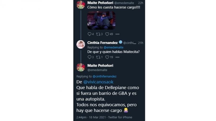Minutos después, Maite Peñoñori le aclaró a Fernández: "De @vivicanosaok, que habla de Dellepiane como si fuera un barrio de GBA y es una autopista. Todos nos equivocamos, pero hay que hacerse cargo", reiteró la periodista sobre Viviana Canosa.