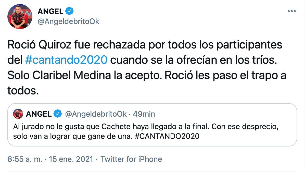 “Rocío Quiroz fue rechazada por todos los participantes del Cantando 2020 cuando se la ofrecían en los tríos. Solo Claribel Medina la aceptó. Rocío les paso el trapo a todos”, confesó Ángel en su cuenta de Twitter, tras la eliminación de la cantante y su compañero, luego de enfrentarse en las semifinales con Ángela Leiva y Brian Lanzelotta.