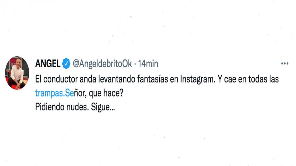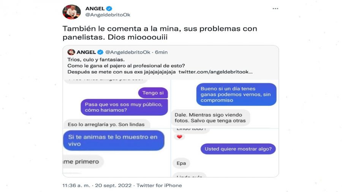 En otro tuit, De Brito especifica: "Tríos, culo y fantasías. ¿Como le gana el pajero al profesional de esto? Después se mete con sus exs jajajajajajaja". En los mensajes que acompañaron esas declaraciones de Ángel, se podían leer mensajes así: "Si te animas te lo muestro en vivo", comentó el conductor, mientras que la mujer con la que hablaba respondió: "Mostrame primero".