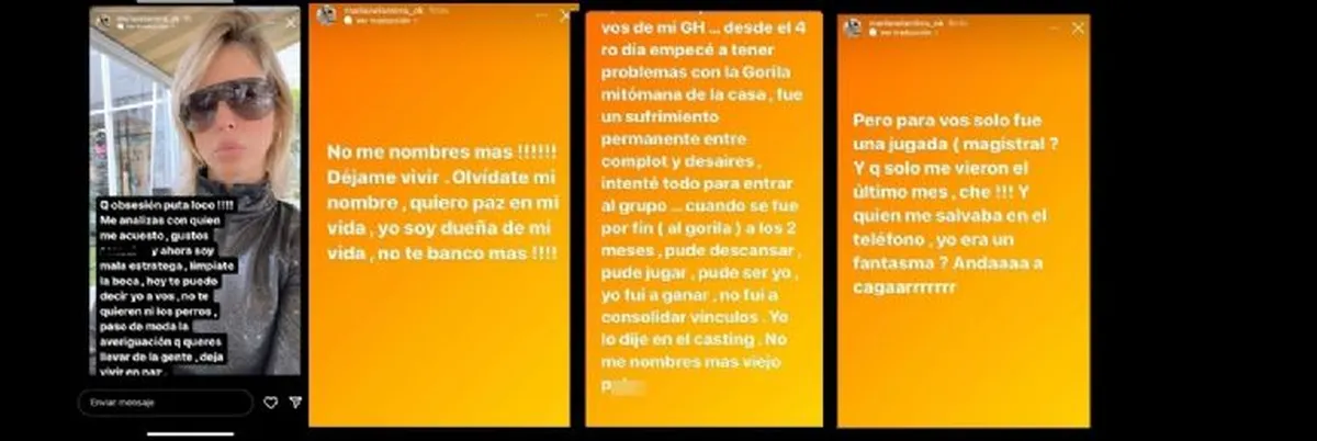 "Superame, en mi vida ni existís. Desde el cuarto día empecé a tener problemas con la gorila mitómana de la casa. Fue un sufrimiento permanente entre complot y desaires. Intenté todo para entrar al grupo hasta que cuando se fue por fin a los dos meses, pude descansar, pude jugar, pude ser yo".